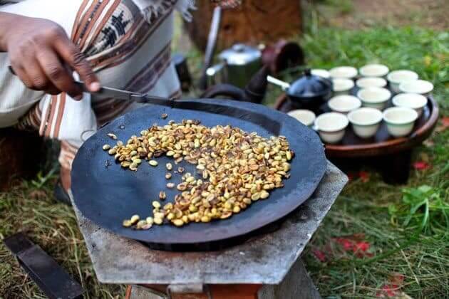 The traditional bunna mafrat (coffee ceremony) involves roasting green beans over coals, grinding them by hand, and brewing in a clay pot called a jebena. Three rounds are served — each one slightly weaker, the last considered a blessing. The ceremony can last two to three hours.